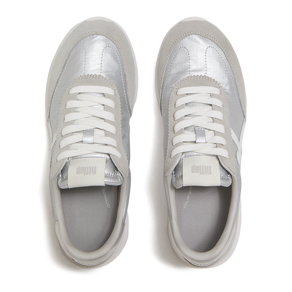 • 金屬感布料與質感麂皮拼接製成